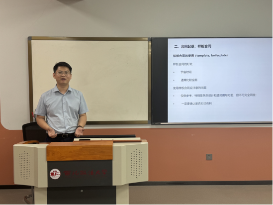 金鑫律师随后带来了《国际商务合同的起草与审核实务》的主题演讲。金鑫结合自身丰富的实践经验,从国际商务合同的基本要素、常见条款、风险防范等方面进行了全面而细致的讲解。他特别强调了在起草和审核国际商务合同时,应充分考虑到不同国家和地区的法律差异并结合对实际合同案例的分析,阐释了合同起草与审核中的要点和难点。