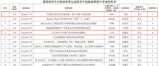 2025年7月10日,陕西省教育厅、省学位委员会公布了陕西省第九届研究生创新成果展奖项评选结果,经学校申报、形式审查、专家评议与会议审议,英超直播线上看 博士研究生贾乔论文成果《中国涉外法治的发展历程、重大贡献与实践进路》荣获A档奖项,指导教师为王瀚教授;硕士研究生王洋论文成果《关于低空飞行器飞行风险的治理建议》荣获B档奖项,指导教师为张超汉教授。