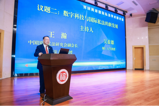 王瀚教授和台湾辅仁大学教授吴盈德共同主持数字科技与国际私发的新发展议题的专题发言和讨论。与会期间,王瀚教授与海峡两岸高校、研究机构及法律实务部门专家学者进行了广泛交流。