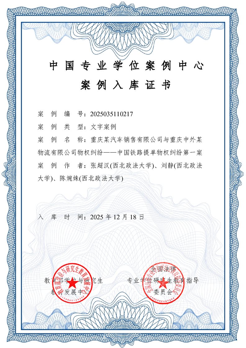 近日,全国法律专业学位研究生教育指导委员会公布第五批法律硕士专业学位文字教学案例评审结果。由张超汉教授团队(张超汉、刘静、陈婉姝)撰写的《重庆某汽车销售有限公司与重庆中外某物流有限公司物权纠纷——中国铁路提单物权纠纷第一案》,经过多轮专家严格评审,入选“中国专业学位案例中心案例库”。