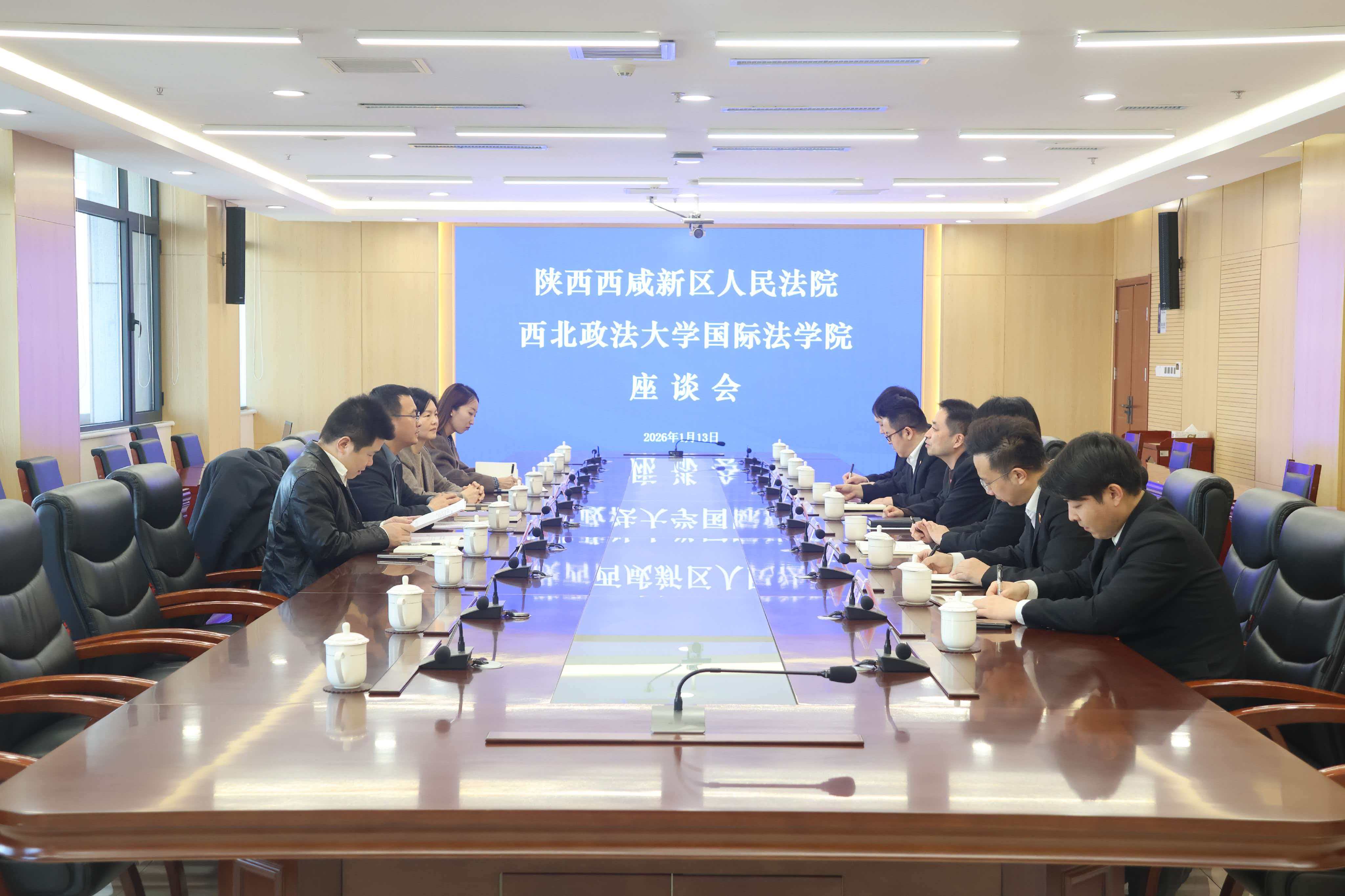 2026年1月13日,张超汉院长一行赴陕西西咸新区人民法院,与该院分党组成员、副院长张鹏,审判委员会委员张宁,民二庭庭长王利屯,综合审判庭庭长辛燕等举行座谈,共商院校合作与涉外法治人才培养事宜。贺小丽副院长、李照东博士、刘静博士一同调研。