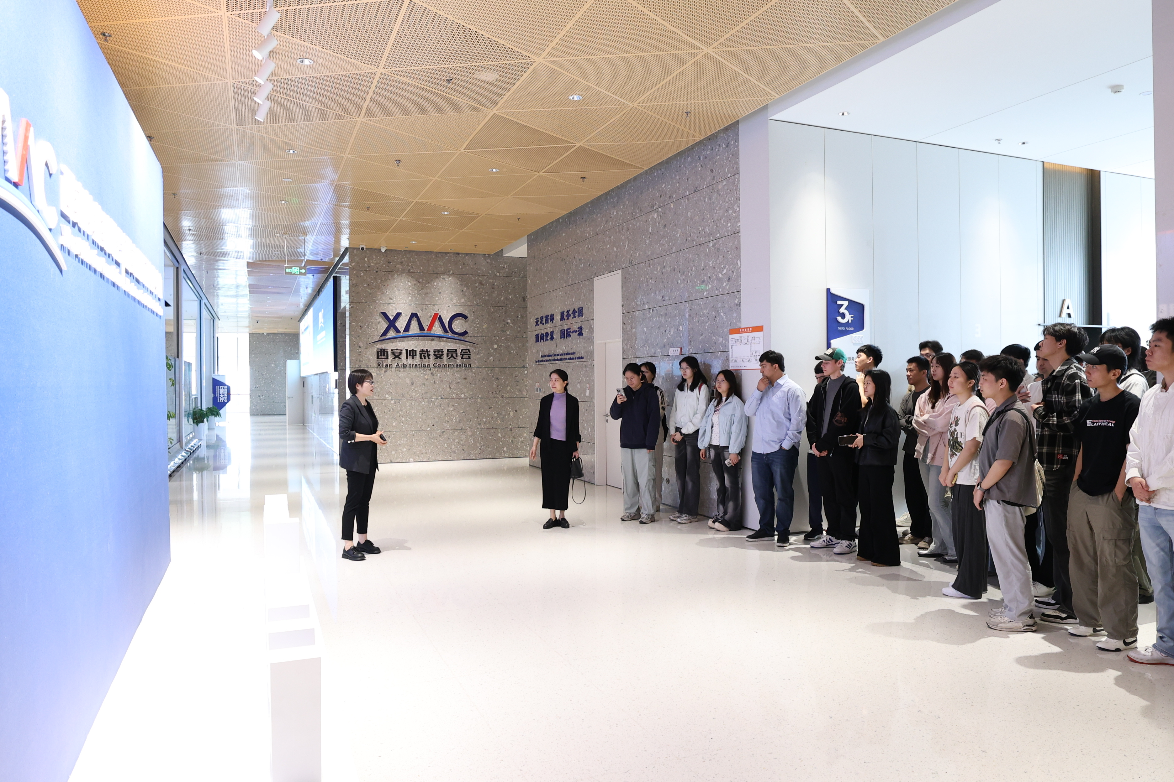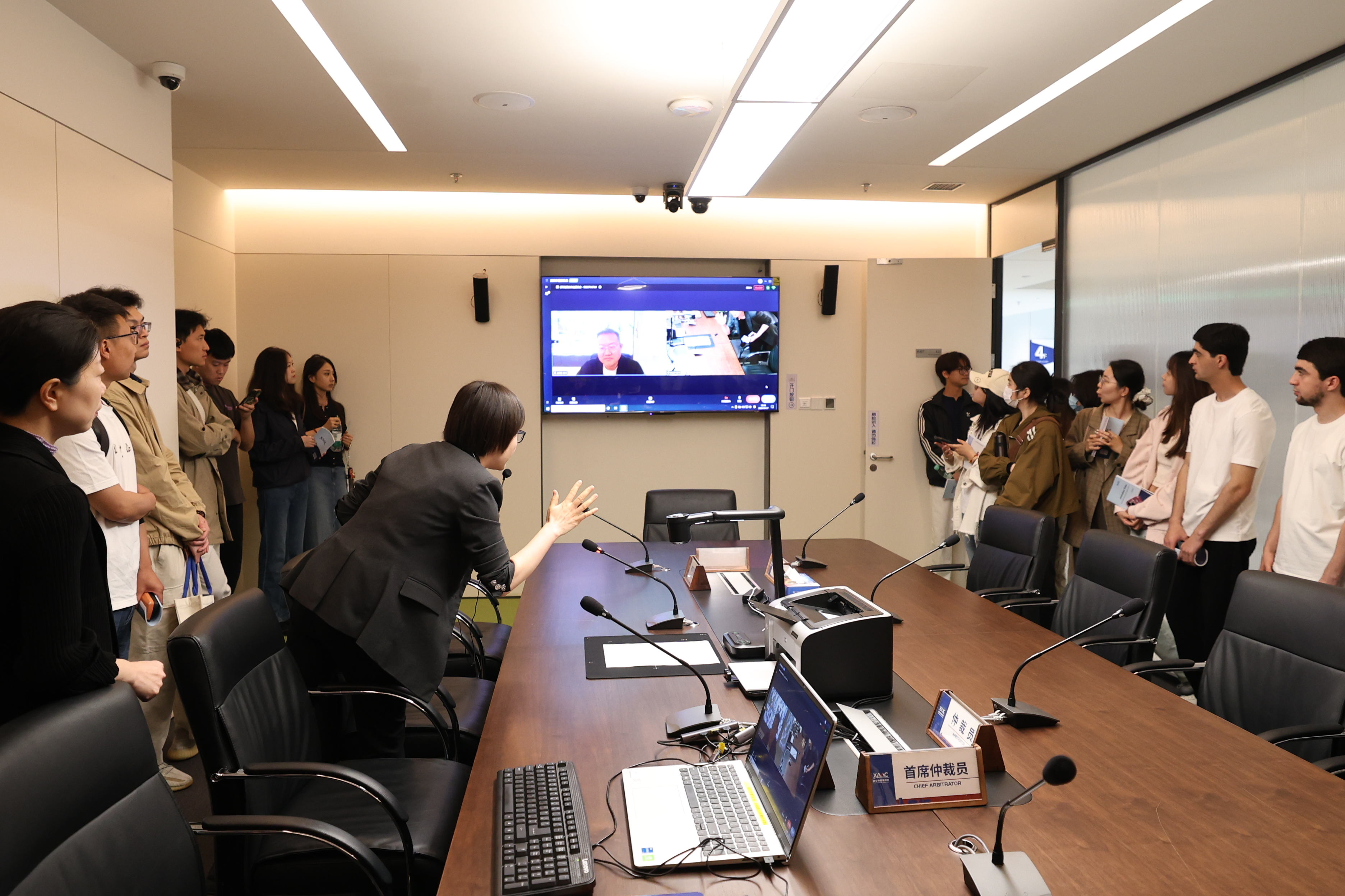 研学团队重点走访了西安仲裁委员会立案大厅、标准仲裁庭、线上仲裁厅等功能区域,感受西仲标准化、智慧化、规范化仲裁办公办案体系。随后,全体师生共同观看西安仲裁委员会官方主题宣传短片,感悟西仲深耕丝路法治、坚守公正初心的发展理念。同学们结合课堂所学理论知识和未来职业规划,踊跃提问,现场氛围热烈。