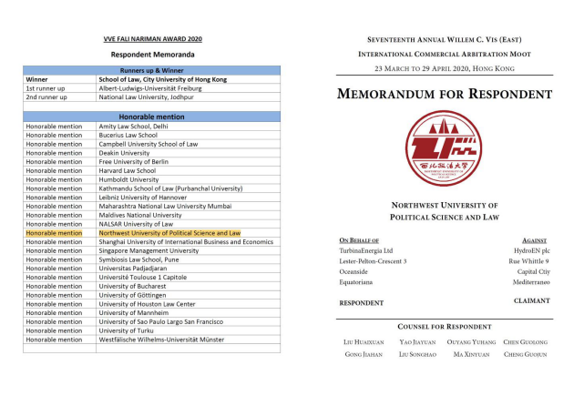我校代表队获得最佳文书荣誉提名奖,同获此项奖励的还有哈佛大学、柏林洪堡大学、汉诺威大学等顶尖法律院校。此次获奖是继去年在中国国际经济贸易仲裁委员会举办的第十七届“贸仲杯”国际商事仲裁模拟仲裁庭辩论赛中夺得全国季军以来,我校同一代表队的再次出征,也是我校在全英文模拟法庭竞赛领域取得的又一历史性成就。我校学生思维敏捷、沉着应战,在国际赛场上展现了我校涉外卓越法律人才的培养成效。