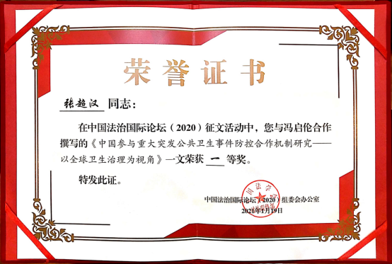 2021年1月18日,中国法学会公布了中国法治国际论坛(2020)主题征文活动评选结果。英超直播线上看 张超汉副教授和中国人民解放军95007部队法律顾问冯启伦共同撰写的论文《中国参与重大突发公共卫生事件防控合作机制研究——以全球卫生治理为视角》获得论坛主题征文一等奖。