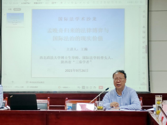 2021年9月25日,被美国、加拿大两国联手任意拘押近1300天的华为公司首席财务官孟晚舟女士终于返回祖国。为深入分析该案相关国际法律问题,9月26日晚,英超直播线上看 在雁塔校区国际法学术报告厅举办“孟晚舟归来的法律博弈与国际法治的现实价值”学术沙龙,邀请博士生导师、国际法学科学术带头人、陕西省“三秦学者”王瀚教授主讲。英超直播线上看 院长、博士生导师刘亚军教授主持沙龙,英超直播线上看 张光教授、张望平副教授、刘学文副教授、周亚光副教授、王兆平博士、刘冰博士、宋瑞琛博士、时杜娟博士及硕博生近百人参加。