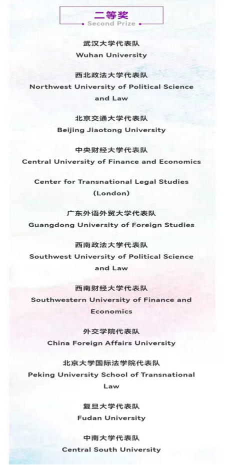 我校自2003年起即参加此项赛事,取得了多项优异成绩。此次比赛期间,我校代表队逻辑思维条理清晰,表达稳重得体,辩论流畅自如,展现了坚实的英语语言能力基础和法律专业知识素养,获得具有丰富经验的海内外专业仲裁员、大赛组委会的高度评价和肯定。