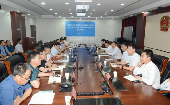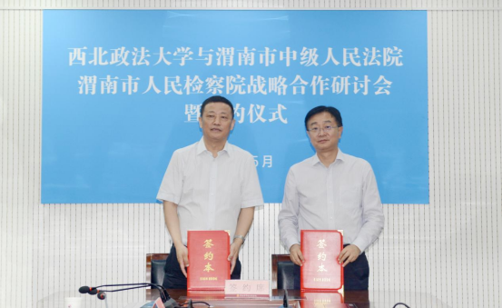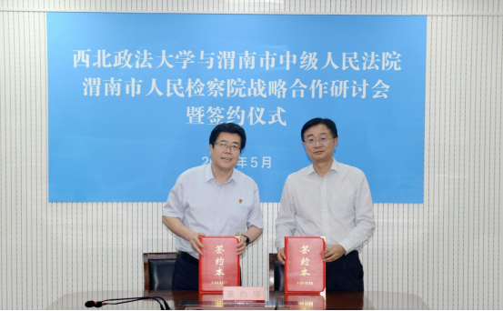 为深入贯彻落实习近平法治思想,深化我校与司法实务部门战略合作,5月24日,校长范九利、副校长张军政带队前往渭南市参加西北政法大学与渭南市法检两院战略合作研讨会并签署合作协议。