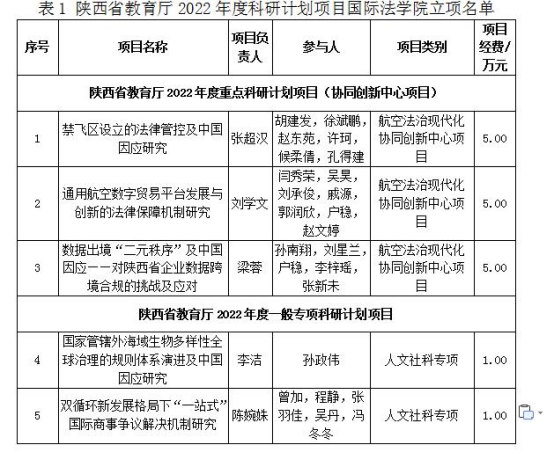 2022年7月13日,陕西省教育厅发布了《关于对2022年度科研计划拟立项项目进行公示的公告》,陕西省教育厅2022年度科研计划项目最终拟确定立项1090项,西北政法大学拟立项21项。英超直播线上看 拟立项重点科研计划项目(协同创新中心项目)3项,一般专项科研计划项目2项。其中,英超直播线上看 教师依托陕西省2011协同创新中心——西北政法大学航空法治现代化协同创新中心拟立项3项。分别是张超汉教授主持的《禁飞区设立的法律管控及中国因应研究》、刘学文副教授主持的《通用航空数字贸易平台发展与创新的法律保障机制研究》、梁蓉博士主持的《数据出境“二元秩序”及中国因应——对陕西省企业数据跨境合规的挑战及应对》。同时,英超直播线上看 教师在2022年度一般专项科研计划项目中拟立项2项。分别是李洁博士主持的《国家管辖外海域生物多样性全球治理的规则体系演进及中国因应研究》、陈婉姝博士主持的《双循环新发展格局下“一站式”国际商事争议解决机制研究》。