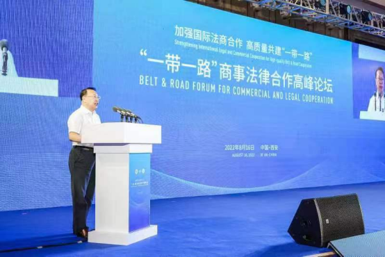 2022年8月16日,陕西省首届“一带一路”商事法律合作高峰论坛作为第六届丝博会重要活动之一,在西安举办。陕西省委常委、省委政法委书记刘强出席论坛并致辞。中国国际贸易促进委员会副会长柯良栋线上致辞。陕西省贸促会会长马玉红主持开幕式。