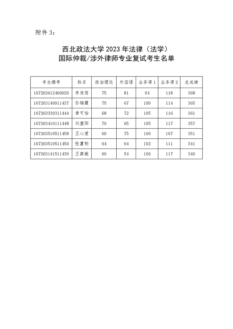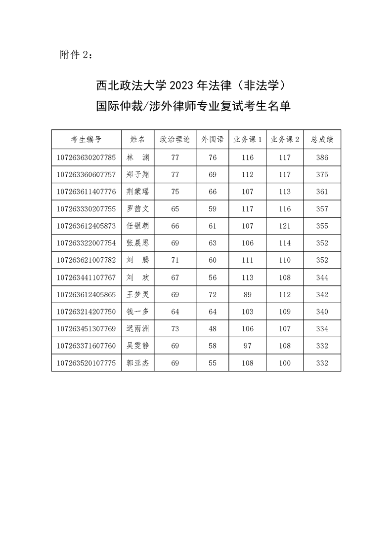 西北政法大学 2023 年国际法学硕士研究生拟录取名单公示