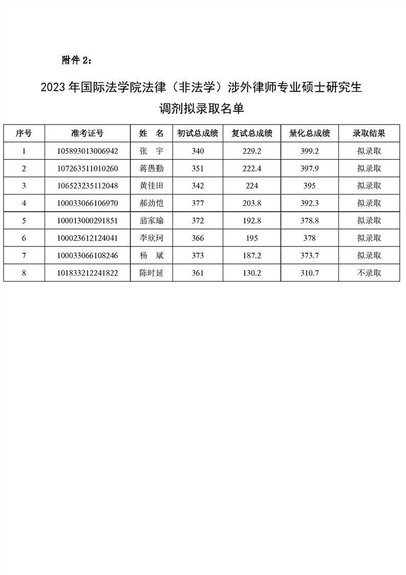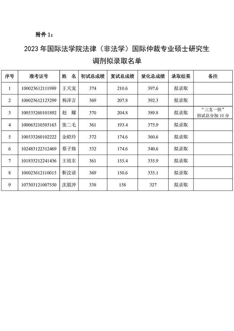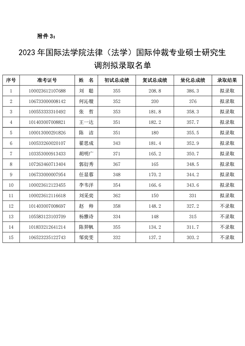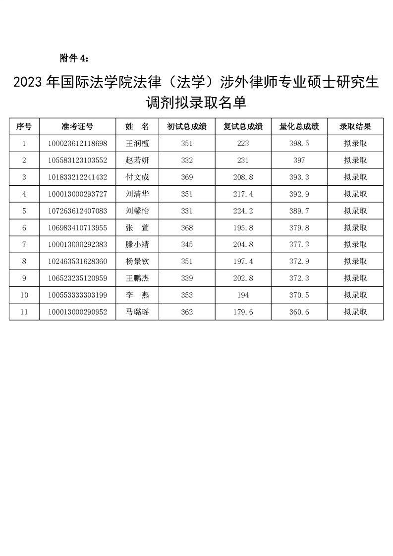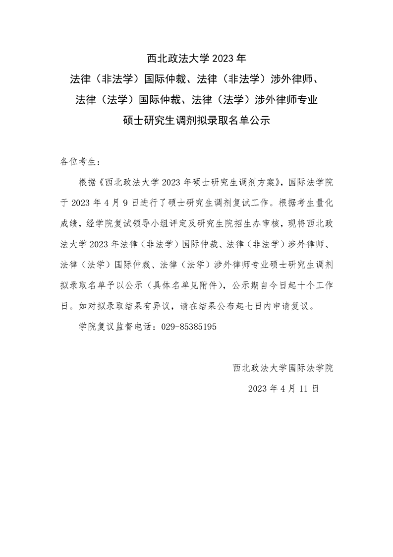 西北政法大学2023年法律硕士(国际仲裁、涉外律师)调剂拟录取名单公示